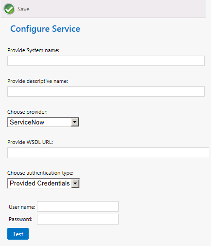 To integrate with an ITSM system other than ServiceNow or Remedy, click Add System on the Site Management > ITSM Integration view and enter the connection information on the Configure Service view.