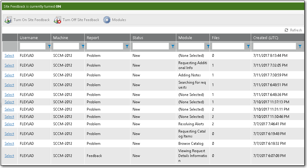 2. To view the details of a feedback submission, click Select next to the feedback issue you want to view. The Feedback Details view opens, displaying both the text of the submitted feedback issue and a list of the files that were uploaded with the feedback issue.