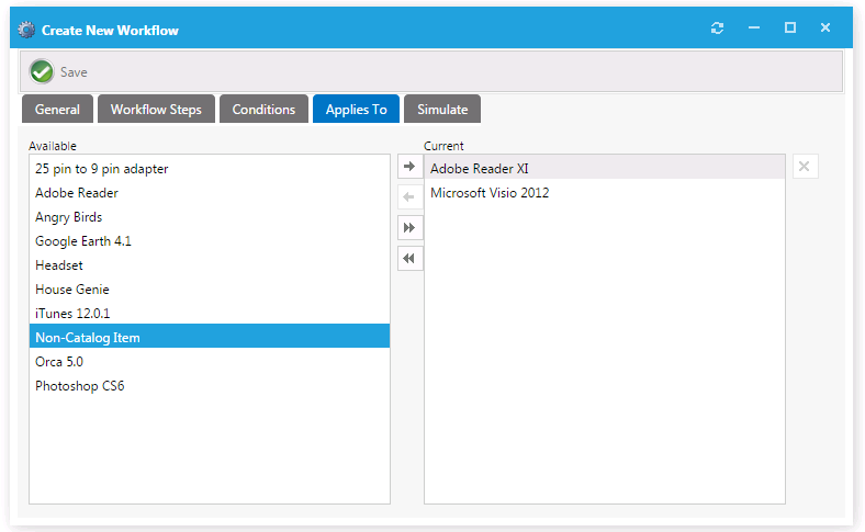 16. Open the Applies To tab, which you can use to identify which catalog items that this workflow applies to.