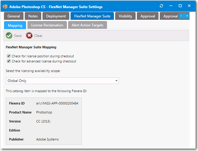 5. Click Save. The catalog item is now mapped to a software entry in FlexNet Manager Suite, and the product information is now listed at the top of the dialog box. Also, additional options are displayed.