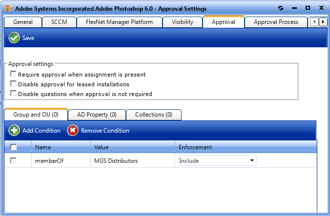 Click the Select button to add the condition. The condition is listed on the Approval tab.