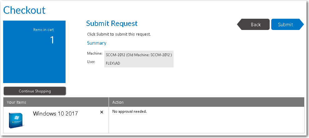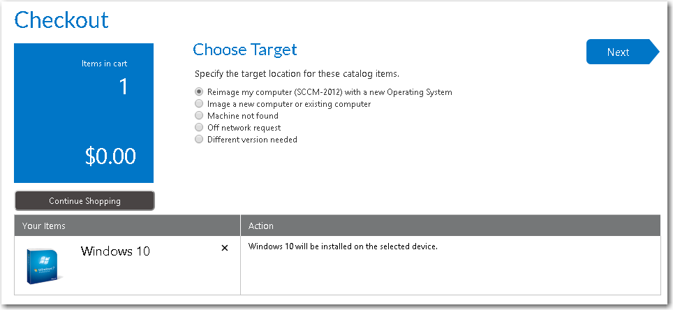 1. On the Browse Catalog tab, locate an OS deployment task sequence catalog item, and click Add to add it to your cart. The Choose Target panel of the Checkout Wizard opens.