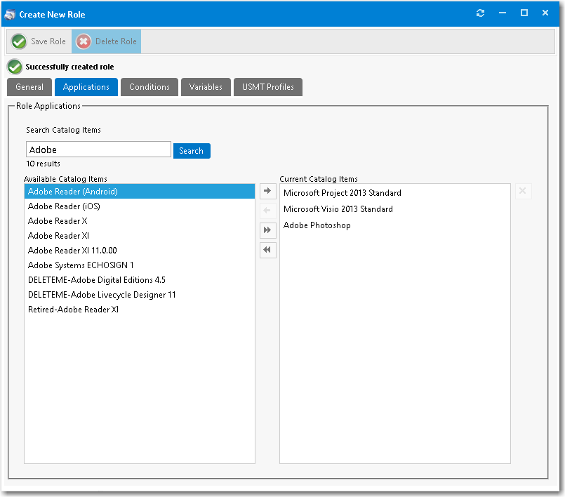 8. Click Save Role to create the new role. You will notice the following tabs become available for you to further configure the role properties: Conditions, Variables, and USMT Profiles.